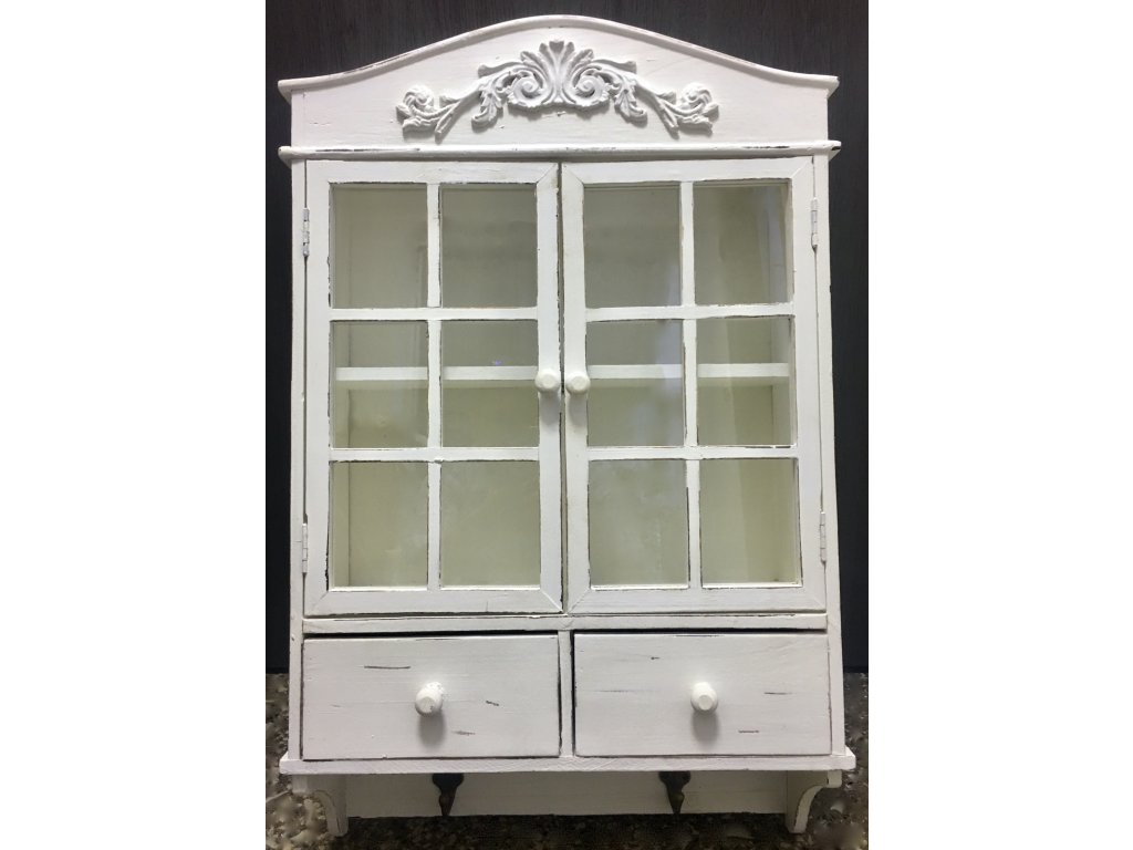 Biela vintage skrinka na zavesenie, so šuflíčkami a presklennými dvierkami, v spodnej časti 2 háčiky.