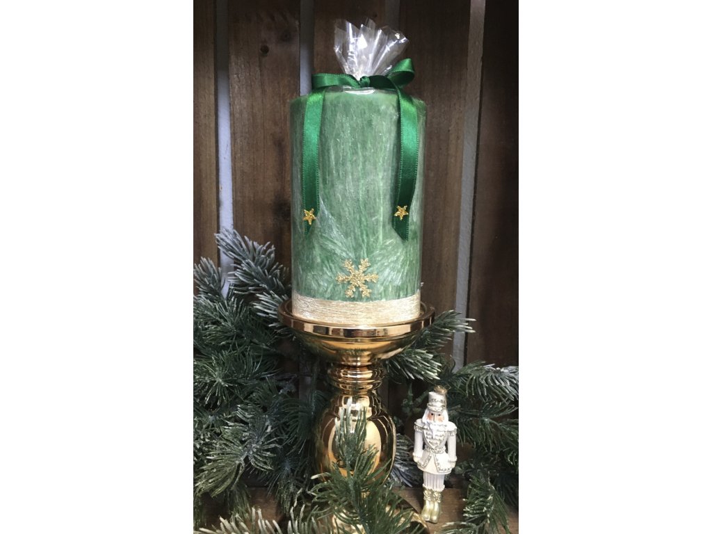 Ručne vyrobená sviečka z palmového vosku, vianočná zeleno - zlatá.Rozmery sviečky: výška 13 cm, priemer 8 cm, váha 590 g.
