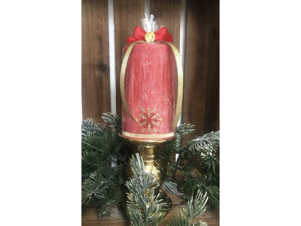 Ručne vyrobená sviečka z palmového vosku, červená so zlatým dekorom.