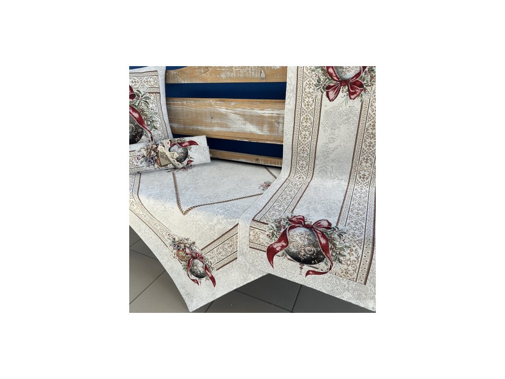 Vianočný obrus gobelínový, pretkávaný zlatou niťou.